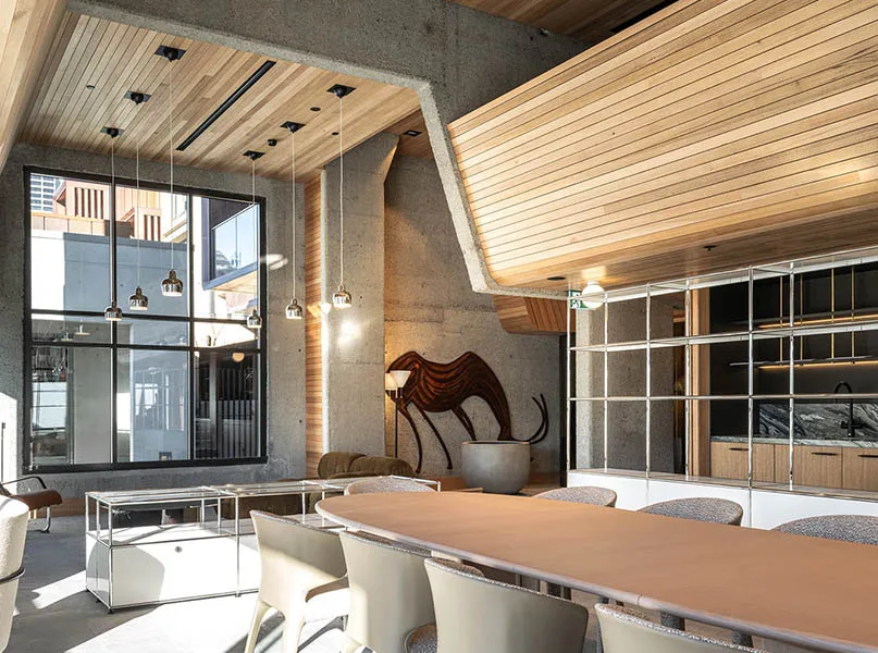The building includes a revitalised common area, which retains original features such as timber batten walls and bison artworks.